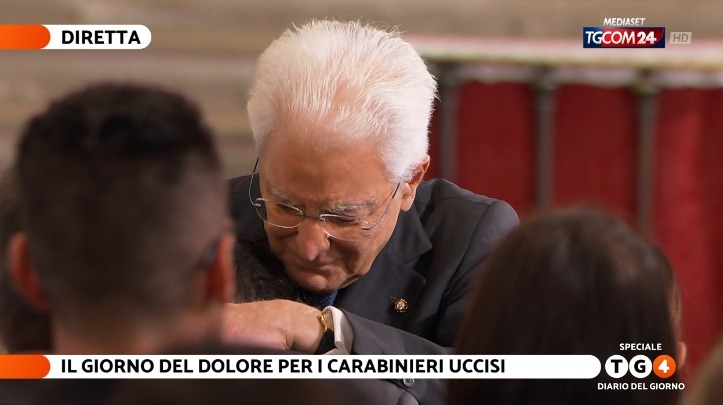 Mentre il sacerdote comincia l’omelia, un commovente momento: Mattarella si è commosso salutando i familiari dei carabinieri.
