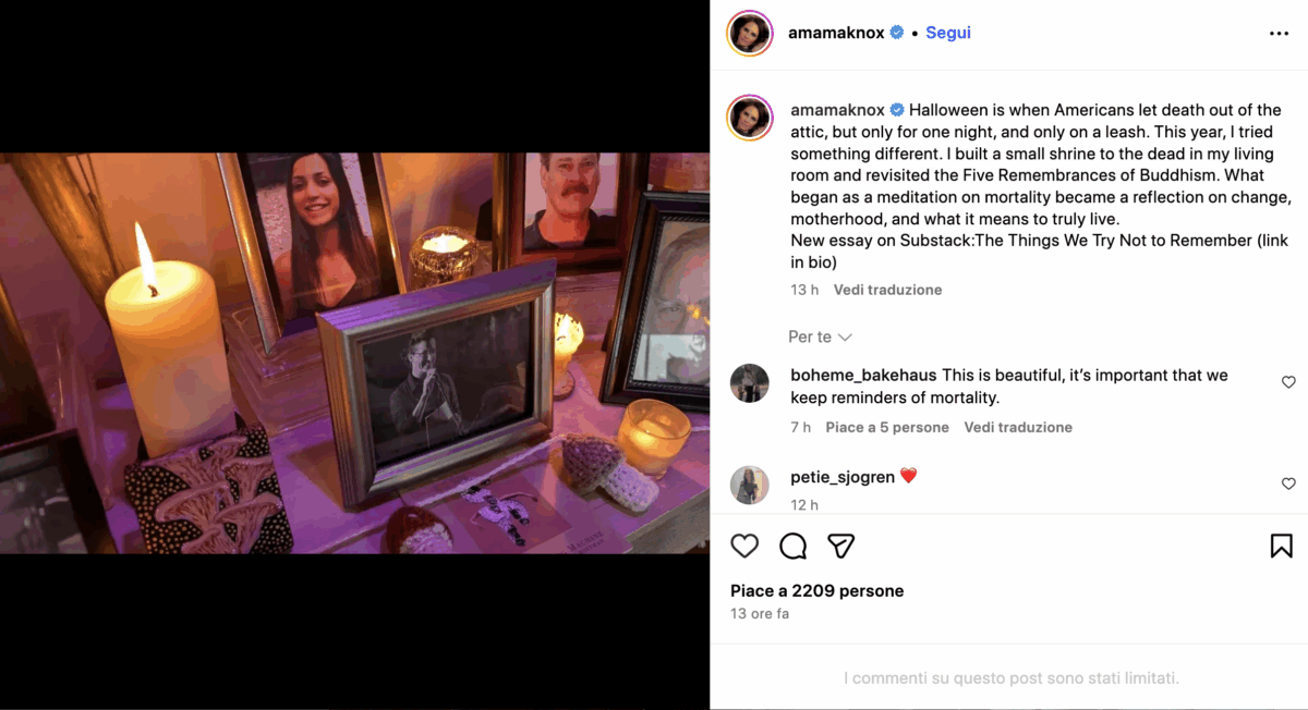 L’immagine fa parte di un post pubblicato su Instagram in occasione di Halloween: «Quest’anno ho costruito un piccolo santuario per i morti», ha scritto Knox, raccontando di aver voluto trasformare la ricorrenza in un momento di meditazione sulla caducità della vita, la maternità e il cambiamento. «Halloween è quando gli americani lasciano uscire la morte dalla soffitta, ma solo per una notte, e solo al guinzaglio».